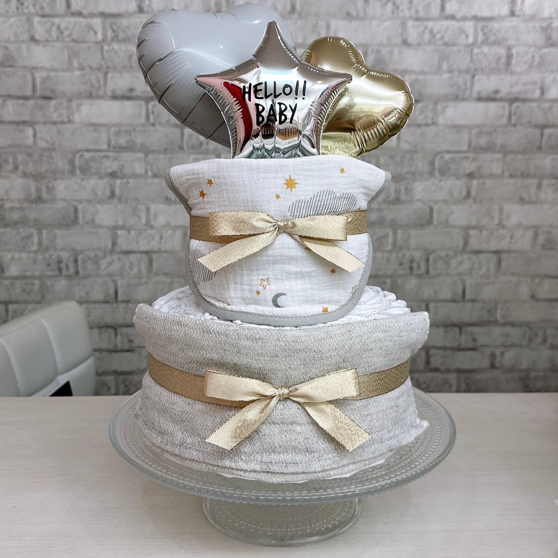 大人優しい色合いのアイテムが揃ったグレーのおむつケーキ⭐︎